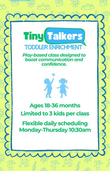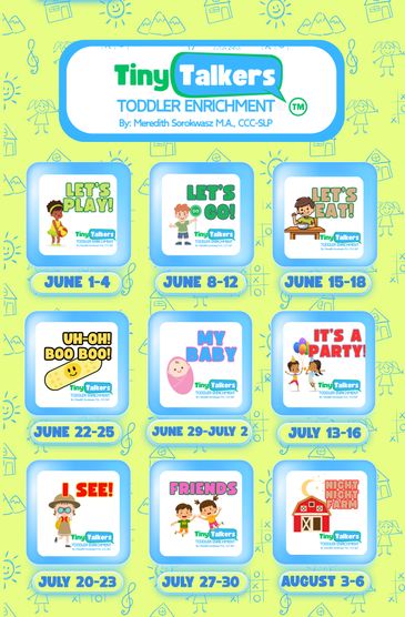 The Tiny Talkers Toddler Enrichment® program was designed by Meredith Sorokwasz M.A., CCC-SLP to help toddlers develop speech, language, pre-literacy and social skills needed to be successful in their environment. Ms. Meredith has over 20 years of experience as an SLP and is an expert in early intervention. The curriculum was developed with a fun, familiar and multimodality approach that kids just love! Classes are limited to 3 children and are held throughout the year. We recommend signing up for 2 sessions per week either Monday/Wednesday or Tuesday/Thursday.